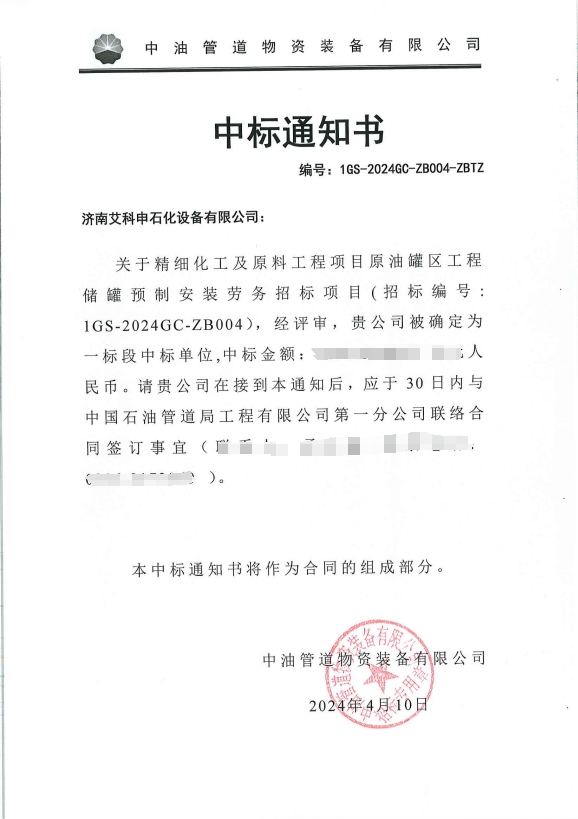 热烈庆祝济南艾科申石化设备有限公司在《精细化工及原料工程项目原油罐区工程储罐预制安装标段一(4台15万立原油储罐)》项目中标